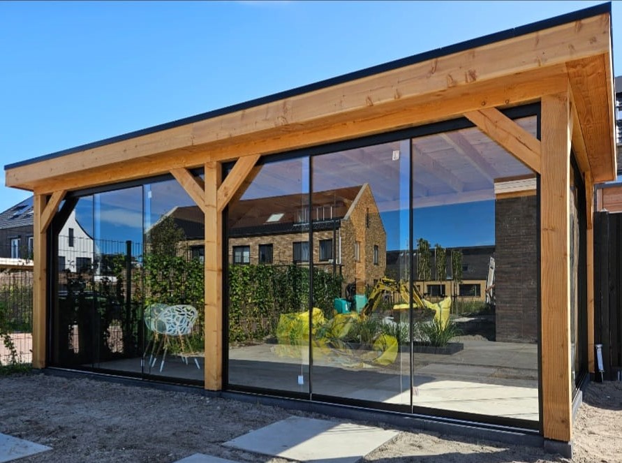 Wanden (optioneel): Voor extra beschutting of juist comfort kunnen Douglas wanden worden toegevoegd. Gemaakt van bijvoorbeeld shutters, Douglas Zweeds rabat of een glazen schuifwand.