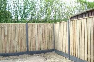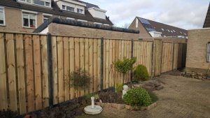 De standaard hout beton schutting is een betaalbare en duurzame optie. Deze schutting bestaat uit stevige betonpalen van 10cm dik met daar tussen een onderplaat van 180 cm breed en 26 cm hoog. Dit gecombineerd met een tuinscherm van 180 cm hoog die weer voorzien is van een stevige afdekkap. Deze afdekkap loopt taps toe zodat er geen water op kan blijven staan.